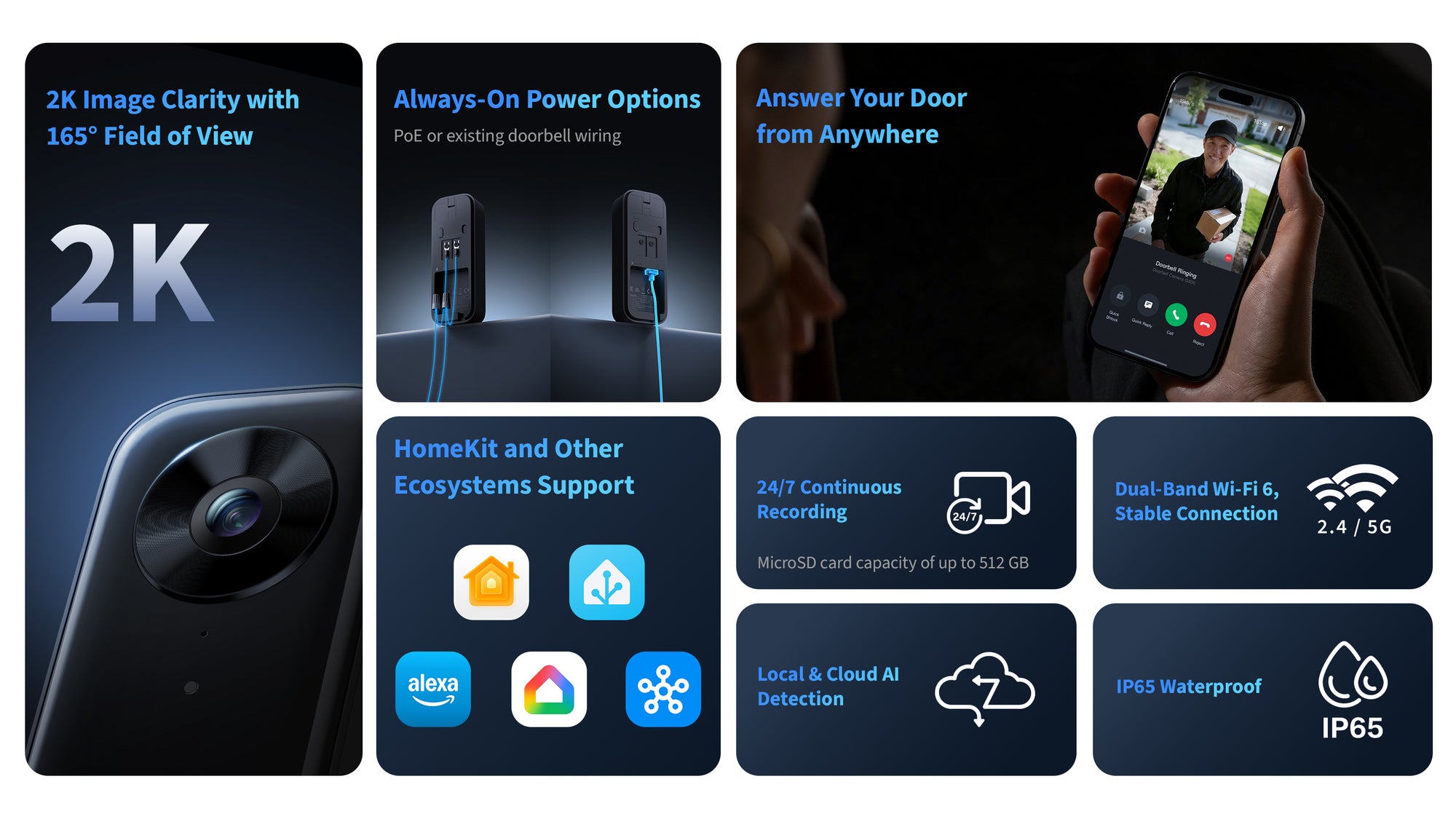 Reliable Hardwired Power & Stable Wi-Fi 6: You can utilize the high-efficiency PoE connection or reuse your existing 8–24V AC/DC wiring, simplifying the upgrade path while maintaining stability. Additionally, the Wi-Fi video doorbell supports both 2.4GHz and 5GHz Wi-Fi 6 and meets WPA3 security standards for reliable and secure connections. *Note: Does not work with your existing traditional chime.