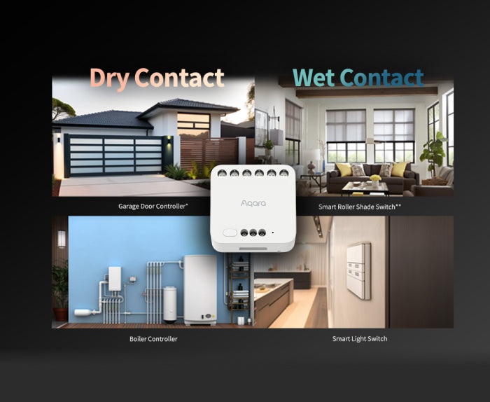 [Dry Contact Mode] The Aqara Dual Relay Module T2 supports dry (or potential-free) contact mode with both pulse and on-off switching, which allows you to integrate a great variety of electrical devices such as boilers, garage doors and much more into your smart home setup. (*Note: Neutral wire is required.)