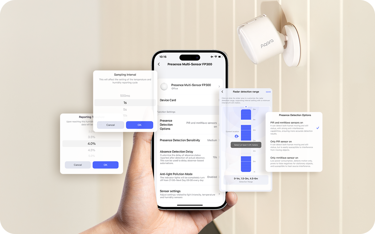 In Zigbee mode, fine-tune your sensor's detection range, adjust reporting frequency, set absence delays, or turn off individual sensors to extend battery life—all through the Aqara Home app.