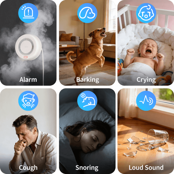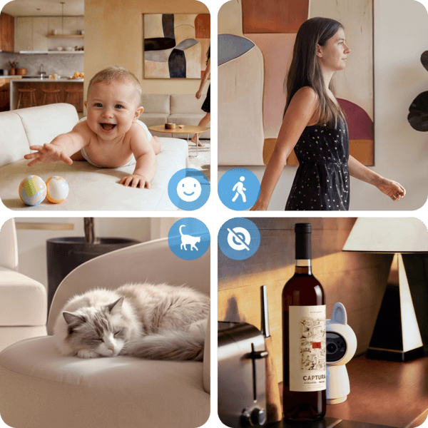 Smarter Image & Sound Local AI Detections: Face, Pet, Gesture & Sound Recognition. Smart and private by design—all AI processing happens locally on the device, with no cloud upload. Faster response, better privacy. G350 detects faces, pets, and 6 specific sounds (baby crying, coughing, dog barking, etc.). Its exclusive static & dynamic gesture recognition lets you trigger scenes with a "OK" sign or a simple wave. Real-time alerts for baby crying and more keep you informed, right when it matters.
